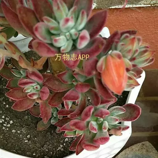 多年生小灌木状多浆植物,灰绿色卵状倒披针形肥厚肉质叶轮状互生,全缘,椭圆尖头, 锦晃星 长3cm-4cm,宽2cm~2.5cm,厚约1cm,玲凉季节阳光下,叶端及上缘呈红色。棕褐色茎细棒状,0.8cm~1cm,下端横卧,分枝群生,高15cm~20cm。晚秋至初春由枝头抽出花梗,开鲜红色5瓣花,小花钟形,半开状,花长1-5cm,穗状花序。