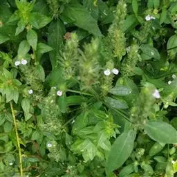 灌木状草本或直立亚灌木,高45厘米或过之。茎纤细,4棱,有极狭的翅,近光滑或被极疏的微毛。叶矩圆状卵形或卵形,连柄长8-10厘米,宽2-2.5厘米,顶端长渐尖,钝,基部渐狭,下延至柄,具0.5-2厘米的柄,边缘具圆齿或浅波状,草质,上面被疏毛,暗棕色,背面灰白色,主脉上被黄褐色柔毛,中肋和侧脉微隆起,侧脉每边4条,近边缘网结。穗状花序顶生或腋生,无梗,单个或3-5个集合,矩圆状卵形。花密集,偏向一侧,苞片披针形,外面被刚毛,长5-6毫米,覆瓦状排列。花萼长6毫米,不等5深裂,外面有髯毛,裂片披针形,长渐尖,有长芒,具1中肋,有黄色边,下方的最宽,两侧最狭,上侧最长。花冠长8-9毫米,冠管钟形,外面被极短反折微柔毛,冠管长3.5毫米,顶端稍收缩,喉里面基部有反折的髯毛,冠檐裂片4,长圆形,顶端圆,下方裂片最宽,顶端短而钝,2齿或全缘。子房卵形被刚毛,花柱极少刚毛,柱头矩圆状头形。花盘环形,稍5裂。