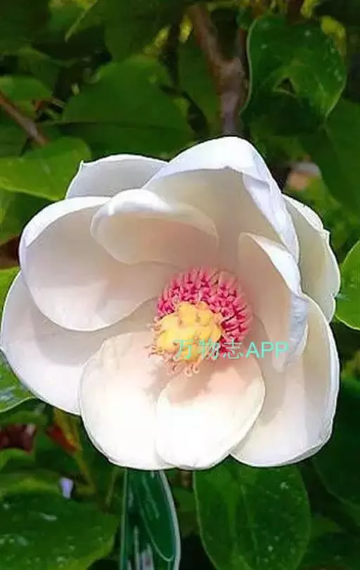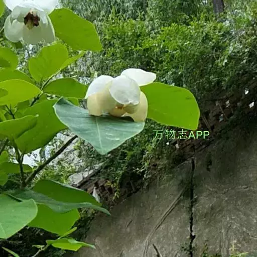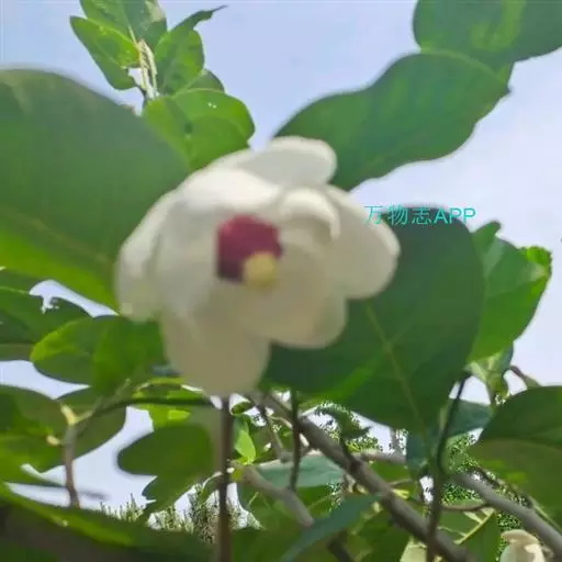 花与叶同时开放,白色,芳香,杯状,盛开时碟状,直径7-10厘米;花梗长3-7厘米,密被褐色及灰白色平伏长柔毛,着生平展或稍垂的花朵;花被片9,近等大,外轮3片长圆状倒卵形或倒卵形,长4-6厘米,宽2.5-3.5厘米,基部被白色毛,顶端宽圆或圆,内两轮6片,较狭小,基部渐狭成短爪;雄蕊紫红色,长9-11毫米,花药长约6毫米,两药室邻接,内向纵裂,顶端微凹或药隔平,不伸出,花丝长3-4毫米;雌蕊群椭圆形,绿色,长约1.5厘米。聚合果熟时红色,倒卵圆形或长圆体形,长2-7厘米;蓇葖狭椭圆体形,长约1厘米,沿背缝线二瓣全裂。顶端具长约2毫米的喙;种子心形,假种皮橘红色,外种皮深褐色,长与宽6-7毫米,顶孔细小末端具尖。