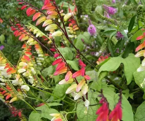 金鱼花(学名:Mina lobata Cerv.)是旋花科,金鱼花属多年生向左旋缠绕草本植物,茎无毛,叶片3裂或全缘。聚伞花序,长达35cm,花偏向一侧;花冠管状,具棱略弯,口部呈坛状,初红色,渐转为淡黄色至白色;叶面浓绿色,多于春季开花,花期20余天。