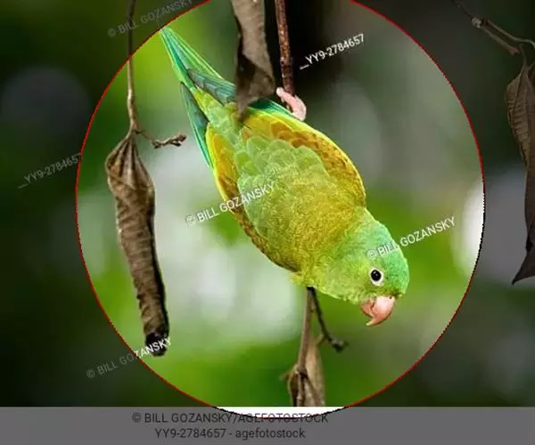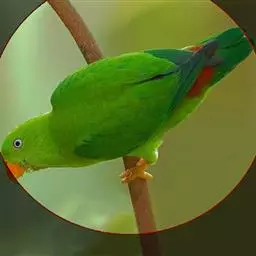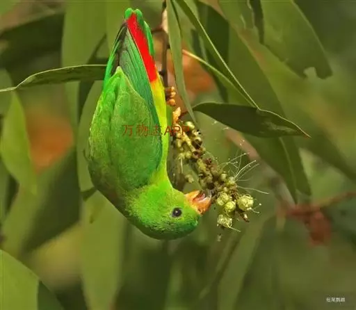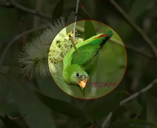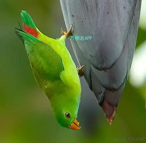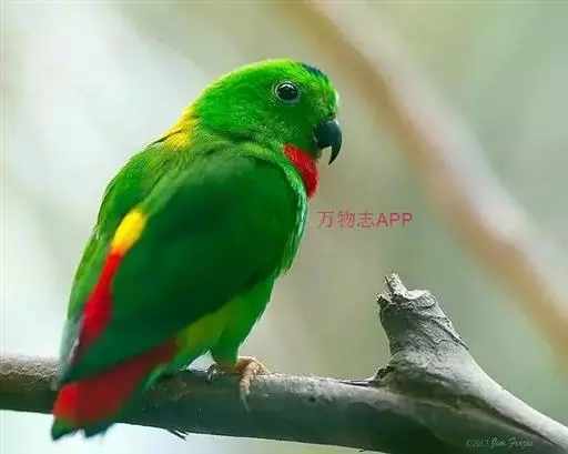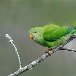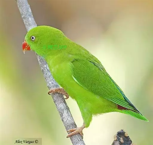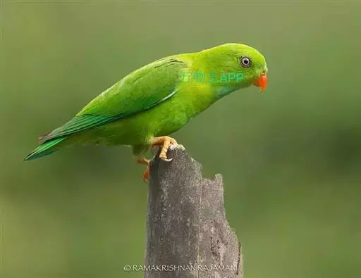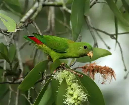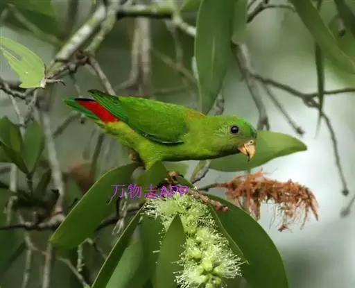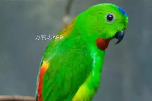 短尾鹦鹉(学名:Loriculus vernalis)是典型的攀禽,体形小,翅长在90毫米左右;尾较翅短;嘴较细削,其厚度不及嘴峰长度;腰下有朱红色块斑;雄鸟喉部有蓝色块斑。鸟喙强劲有力,喙钩曲,上颌具有可活动关节,喙基部具有腊膜。肌肉质舌厚。脚短,强劲有力,对趾型,两趾向前两趾向后,适合抓握和攀援生活。体羽主要是绿色,红嘴红腰,翼下为青绿色带绿色翼衬。