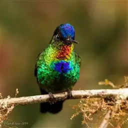 雄性成鸟 整体大致绿色,下体显著较淡,头部较辉亮;喉部有一蓝色块斑;腰和尾上覆羽红色;翅底面蓝绿色;尾羽上绿下蓝。雌性成鸟 整体略较苍暗,喉部蓝斑不显或缺如。