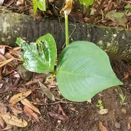 不定芽从块茎萌发形成大型复叶,小叶肉质具短小叶柄,坚部分为肥大的块茎;叶柄基部膨大,木质化;羽状复叶自块茎顶端抽生,每个叶轴有对生或近似对生的小叶6至10对,叶片卵形,厚革质,绿色,有金属光泽。佛焰花苞绿色,船形,肉穗花序较短。