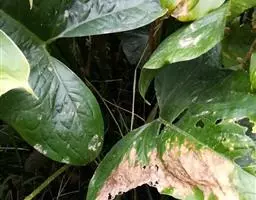 在炎热的夏季,或久雨初晴后的晴好天气,或长时间搁放于室内刚搬到室外进行恢复性养护的盆栽植株,直接暴露在阳光下直晒,很容易造成其肥嫩叶片被灼伤,致使其叶片部分失绿泛白,或整个叶片被灼伤,坏死部分后期变褐发黑。