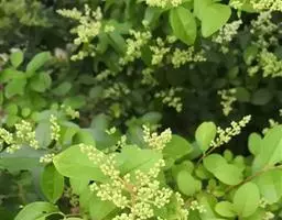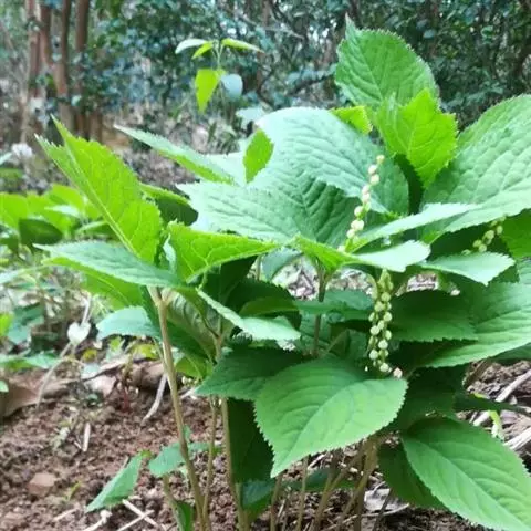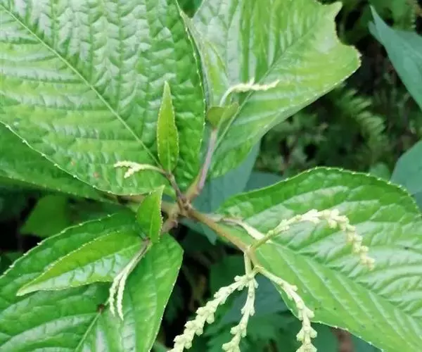 穗状花序顶生,通常两歧或总状分枝,连总花梗长10-16厘米,总花梗长5-8厘米;苞片通常宽卵状三角形或近半圆形;花白色;雄蕊3枚,基部几分离,仅内侧稍相连,中央药隔长3毫米,有1个2室的花药,两侧药隔稍短,各有1个1室的花药,药室在药隔的基部;子房卵形,无花柱,柱头近头状。核果球形,长约3毫米,具短柄。花期4-6月,果期7-8月 。