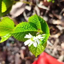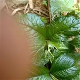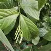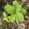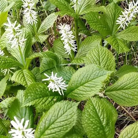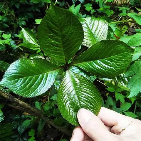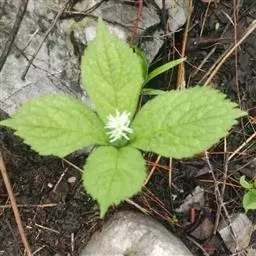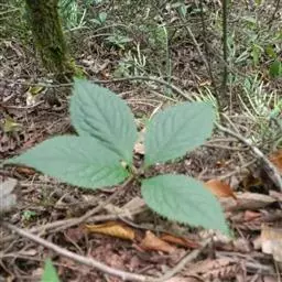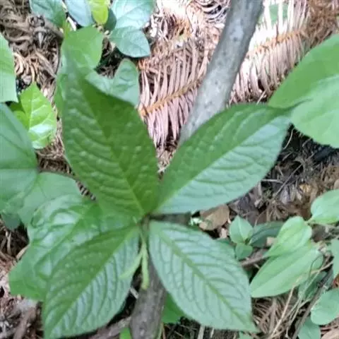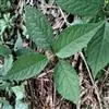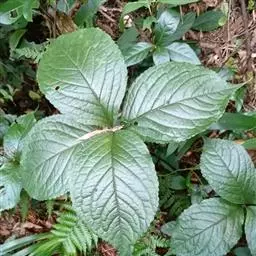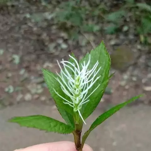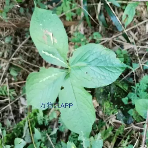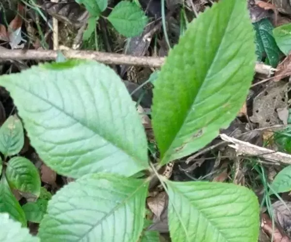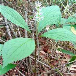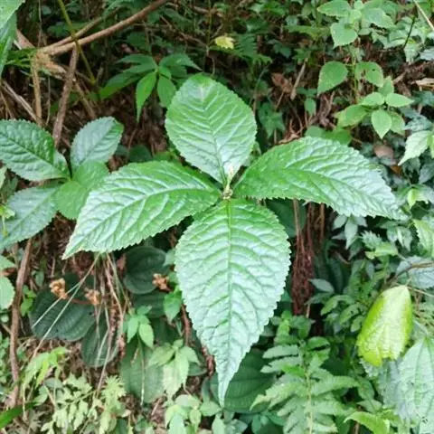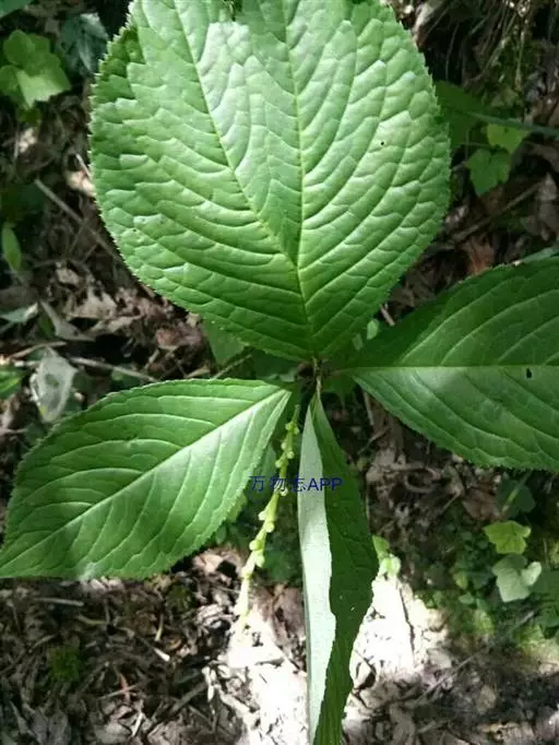 叶对生,通常4片生于茎上部,纸质,宽椭圆形、卵状椭圆形或倒卵形,长9-18厘米,宽5-9厘米,顶端渐尖,基部楔形至宽楔形,边缘具锯齿,齿端有一腺体,背面中脉、侧脉有鳞屑状毛;叶脉6-8对;叶柄长0.5-1.2厘米;鳞状叶卵状三角形,膜质。托叶小,钻形。