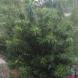 (小花龙血树)DracaenacambodianaPierreexGagnep,百合科Liliaceae,乔木状,高3~4m,茎不分枝或分枝,树皮带灰褐色,幼枝有密环状叶痕。叶聚生于茎、枝顶端,几乎互相套迭,剑形,薄革质,长达70厘米,宽1.5-3厘米,向基部略变窄而后扩大,抱茎,无柄。圆锥花序长在30厘米以上;花序轴无毛或近