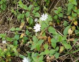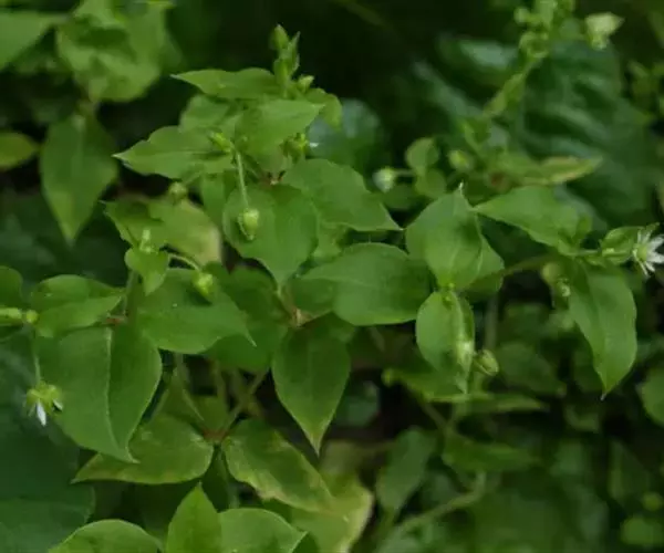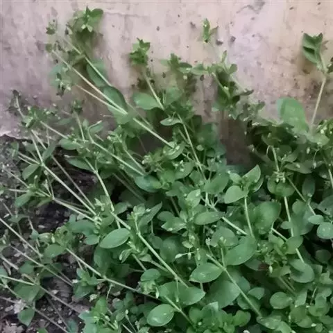 繁缕,别名:鹅肠菜、鹅耳伸筋、鸡儿肠,拉丁文名:Stellaria media (L.) Cyr. 石竹科、繁缕属一年生或二年生草本,高10-30厘米。茎俯仰或上升,基部多少分枝,常带淡紫红色,被1 (-2) 列毛。叶片宽卵形或卵形,顶端渐尖或急尖,基部渐狭或近心形,全缘;基生叶具长柄,上部叶常无柄或具短柄。疏聚伞花序顶生;花梗细弱,蒴果卵形,稍长于宿存萼,顶端6裂,具多数种子;种子卵圆形至近圆形,稍扁,红褐色,直径1-1.2毫米,表面具半球形瘤状凸起,脊较显著。花期6-7月,果期7-8月。