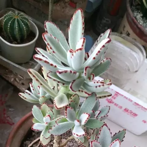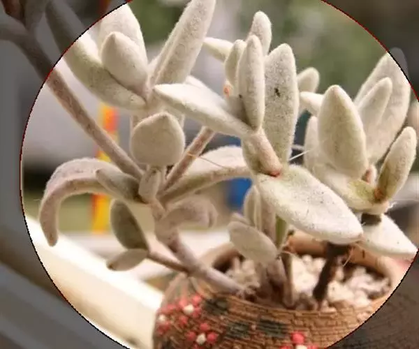 福兔耳(Kalanchoe eriophylla Hilsenberg & Bojer ex Tulasne)是景天科伽蓝菜属的多肉植物 ,野外分布于非洲马达加斯加中部。 植株叶片对生,长梭型,整个叶片及茎干密布白色绒毛。叶片顶端微金黄,叶尖圆型。初夏开花,聚伞花序,花序较高,小花管状向上,花开白粉色,花瓣4片,花期较长。喜阳光充足的环境,夏季要适当遮荫,不能过于荫蔽。喜温暖,冬季温度不能低于10度。生长很缓慢。