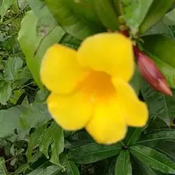 黄蝉属,夹竹桃科,约15种,分布于热带美洲,中国引入栽培的有黄蝉A. neriifolia Hook. 和软枝黄蝉 A. cathartica L. 2种,广州极常见,供观赏。直立或藤状灌木;叶生或轮生;花大而美丽,黄色,数朵排成总状花序,萼5深裂,基部里面无腺体;花冠钟状或漏斗状,喉部有被毛的鳞片;花药与花柱分离;花盘环状,全缘或5裂;子房1室,具两个侧膜胎座,有胚珠多颗;果为一有刺的蒴果,开裂为2果瓣;种子有翅。