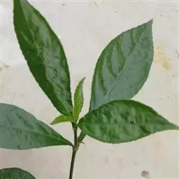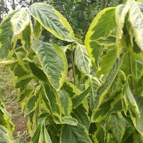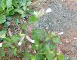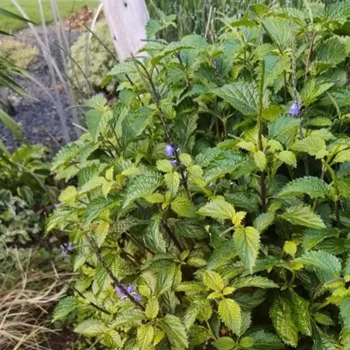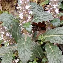 多年生草本植物,低矮、伸展,株高可达80-100厘米;茎基部稍木质化,茎、枝二歧状分枝,幼枝或节被毛;叶对生,灰绿色或蓝绿色,叶厚纸质,叶片常呈椭圆形至椭圆状长圆形,长5-9厘米,宽3-5厘米,叶基楔状,鲜叶近轴面无泡状隆起的细皱,腹面主脉有时略呈紫红色,叶脉处的上下表皮略被疏短毛,侧脉3-5,叶尖钝或圆形,叶缘的锯齿略钝、较宽,齿尖朝前而呈锯齿状,齿数较少;叶柄具翅,长2-3厘米。