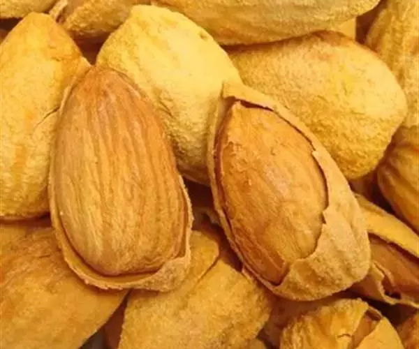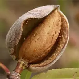 巴旦木 加州巴旦木的果实为灰绿色。随着果实不断成熟变硬,在7月外筴会开裂。从7月底到8月,裂口增大,露出巴旦木壳体。这使得壳内的巴旦木核和果仁得以晒干。整个果仁和茎脱离。临近收获期,外筴外全裂开。