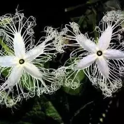 攀援藤本,长达10米;块根圆柱状,粗大肥厚,富含淀粉,淡黄褐色。茎较粗,多分枝,具纵棱及槽,被白色伸展柔毛。叶片纸质,轮廓近圆形,长宽均约5-20厘米,常3-5 (-7) 浅裂至中裂,稀深裂或不分裂而仅有不等大的粗齿,裂片菱状倒卵形、长圆形,先端钝,急尖,边缘常再浅裂,叶基心形,弯缺深2-4厘米,上表 栝楼花 面深绿色,粗糙,背面淡绿色,两面沿脉被长柔毛状硬毛,基出掌状脉5条,细脉网状;叶柄长3-10厘米,具纵条纹,被长柔毛。卷须3-7歧,被柔毛。花雌雄异株。雄总状花序单生,或与一单花并生,或在枝条上部者单生,总状花序长10-20厘米,粗壮,具纵棱与槽,被微柔毛,顶端有5-8花,单花花梗长约15厘米,花梗长约3毫米,小苞片倒卵形或阔卵形,长1.5-2.5 (-3) 厘米,宽1-2厘米,中上部具粗齿,基部具柄,被短柔毛;花萼筒筒状,长2-4厘米,顶端扩大,径约10毫米,中、下部径约5毫米,被短柔毛,裂片披针形,长10-15毫米,宽3-5毫米,全缘;花冠白色,裂片倒卵形,长20毫米,宽18毫米,顶端中央具1绿色尖头,两侧具丝状流苏,被柔毛;花药靠合,长约6毫米,径约4毫米,花丝分离,粗壮,被长柔毛。雌花单生,花梗长7.5厘米,被短柔毛;花萼筒圆筒形,长2.5厘米,径1.2厘米,裂片和花冠同雄花;子房椭圆形,绿色,长2厘米,径1厘米,花柱长2厘米,柱头3。果梗粗壮,长4-11厘米;果实椭圆形或圆形,长7-10.5厘米,成熟时黄褐色或橙黄色;种子卵状椭圆形,压扁,长11-16毫米,宽7-12毫米,淡黄褐色,近边缘处具棱线。花期5-8月,果期8-10月。