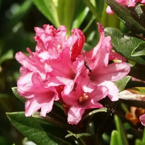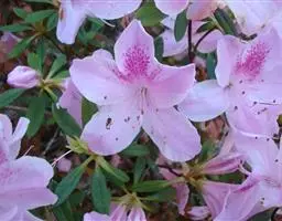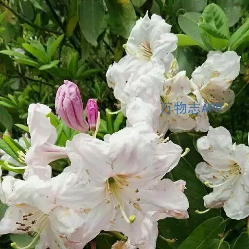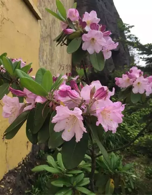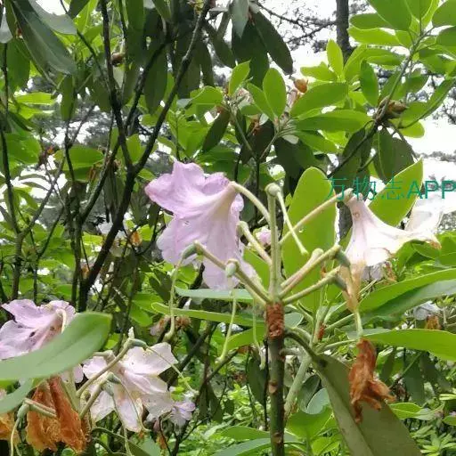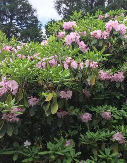 云锦杜鹃(学名:Rhododendron fortunei Lindl.):常绿灌木或小乔木,高3-12米;主干弯曲,树皮褐色,片状开裂;幼枝黄绿色,初具腺体;老枝灰褐色。叶厚革质,长圆形至长圆状椭圆形,上面深绿色,有光泽,下面淡绿色。顶生总状伞形花序疏松,有花6-12朵,有香味;花冠漏斗状钟形,长4.5-5.2厘米,直径5-5.5厘米,粉红色,外面有稀疏腺体,裂片7,阔卵形。蒴果长圆状卵形至长圆状椭圆形,直或微弯曲。花期4-5月,果期8-10月。