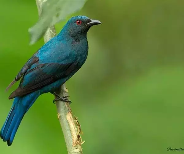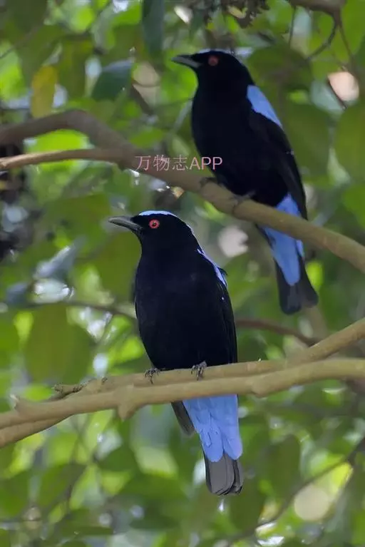 和平鸟(学名:Irena puella)中型鸟类,体长24~28厘米。眼红色,嘴、脚黑色。雄鸟从头顶到尾上覆羽等整个上体辉蓝色具紫色光泽,其余体羽黑色。雌鸟通体铜蓝色,仅飞羽黑褐色。