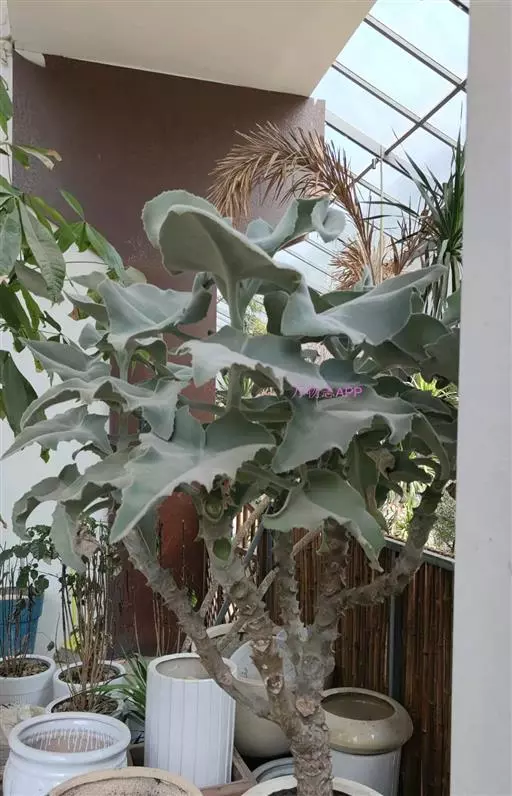 仙女之舞(Kalanchoe beharensis)景天科伽蓝菜属植物。茎高2—3米,幼株茎有灰白色毛。叶有柄,叶柄长3—4厘米,叶对生,广卵圆状三角形,肉质,长10—20厘米、宽5—10厘米。新叶平展,老叶正面稍凹,叶缘有突起,橄榄绿色至灰绿色,被稠密毛,毛银白色至红褐色,亦有无毛的亮叶品种 ,花序高50—60厘米,花径约1.5cm.,花黄绿色。