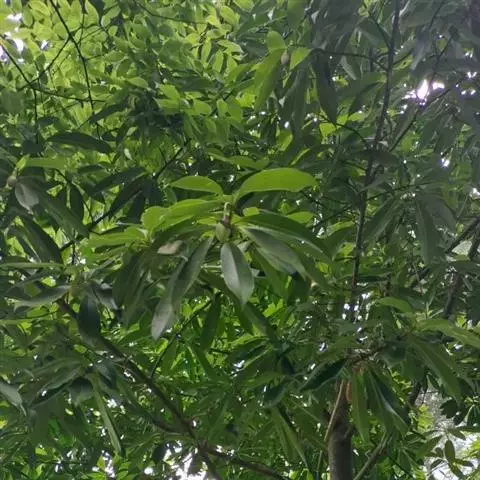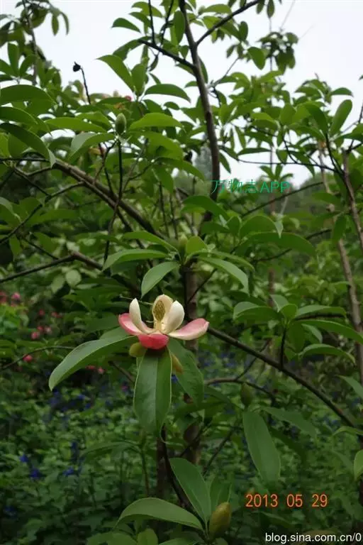 常绿乔木,高达26米,胸径80厘米,树皮灰白平滑。单叶互生薄革质,倒卵形,窄椭圆形或窄倒卵形,长10-20厘米,宽3.5-6.5厘米,先端短尖或渐尖,基部楔形,全缘,长10-20厘米,宽3.5-6.5厘米,直径2厘米,花被9片,乳白色或乳黄色,内质,稍厚。聚合果卵形,有种子5-6枚。花期4-5月,果熟期9-10月,成熟时,假种皮红色。