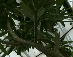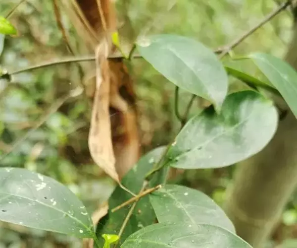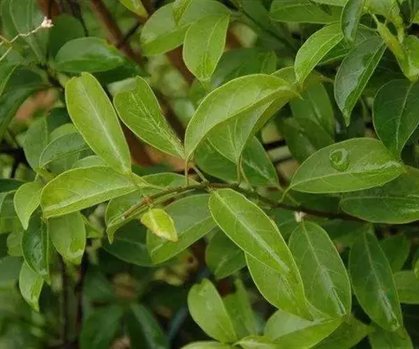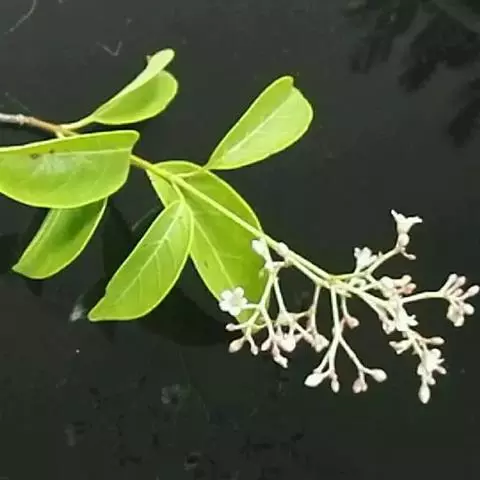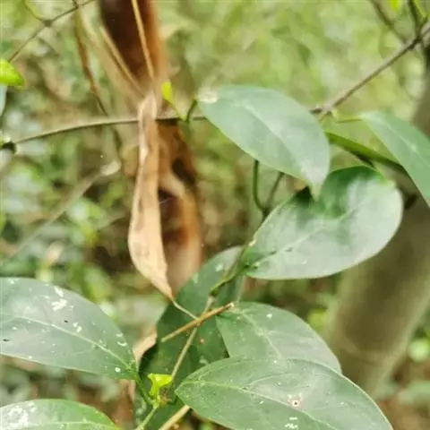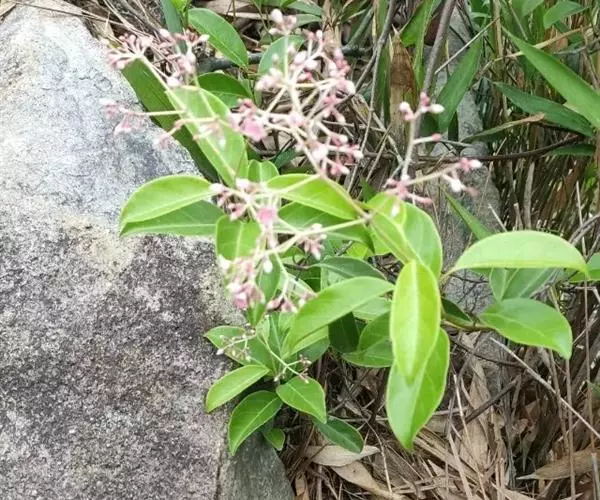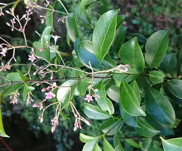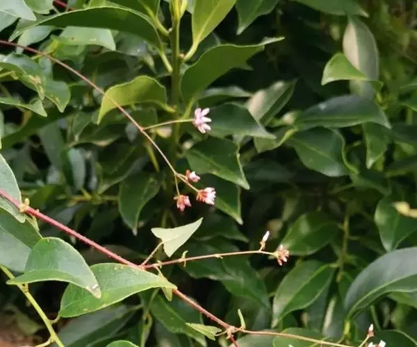 酸叶胶藤 高攀木质大藤本,长达10米,具乳汁;茎皮深褐色,无明显皮孔,枝条上部淡绿色,下部灰褐色。叶纸质,阔椭圆形,长3-7厘米,宽1-4厘米,顶端急尖,基部楔形,两面无毛,叶背被白粉;侧脉每边4-6条,疏距。