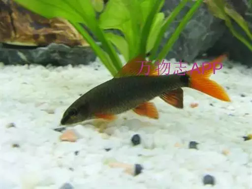 彩虹鲨 彩虹鲨,来自泰国的彩虹鲨在热带鱼中算是中型偏大的品种,它体长可达 14 厘米,身体呈纺锤形,尾鳍叉形,全身为黑墨色,尾鳍呈金红色。红与黑置于一体,色彩分明,别具一格。彩虹鲨的另一标志是背鳍特别宽大,嘴上有二根胡须。 体延长而侧扁。腹部轮廓较为平坦。口前位,吻端具短须。背鳍高且呈三角形,位于鱼体之中后方,整体看来类似鲨鱼之体型。体色一致为黑色,雄鱼体色较深。各鳍均呈深黑色,唯尾鳍为鲜橘红色,胸鳍则淡色,或微橘黄色。最大体长可达12公分。体高似梭形,长5~6厘米。