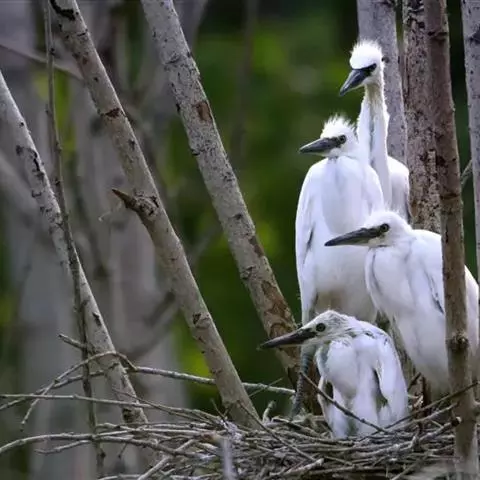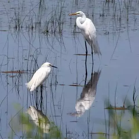 小白鹭(学名:Egretta garzetta):体长52-68厘米,为中型涉禽,全身体羽颇似大、中白鹭,体形纤瘦,全身白色。夏羽枕部有两根细长饰羽,前颈和背着生蓑羽。冬季饰羽及蓑羽脱落。眼先裸皮夏季粉红色,冬季黄绿色。生殖期在枕部有两枚长羽,如双辫状。胸前亦簇生矛状长羽,但没有枕部冠翎长。背上蓑羽的先端均微向上卷曲。生殖期后,冠翎和蓑羽均脱落。眼黄色,嘴黑色,下嘴基部带苍白色,面部裸皮灰色,脚、腿黑色,趾上常杂有黄色。栖息于平原、丘陵和低海拔之湖泊、沼泽地带与滩涂地。以鞘翅目及鳞翅目幼虫、水生昆虫等动物性食物为食,也吃少量谷物等植物性食物。