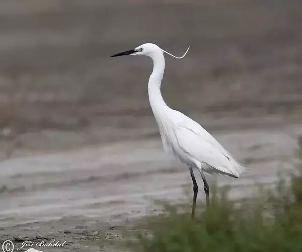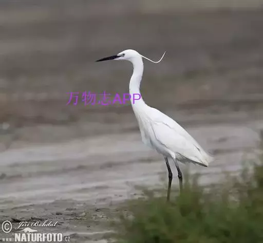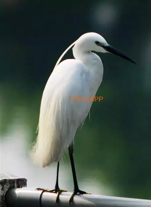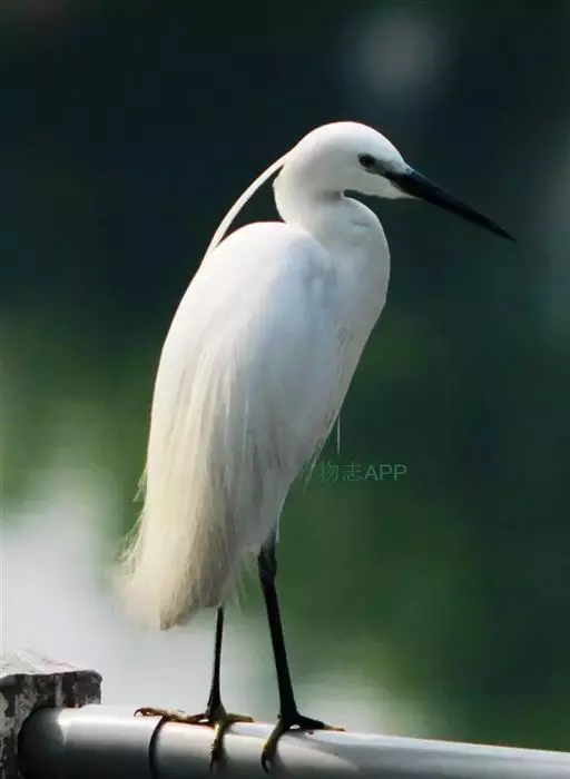 中型涉禽,体长52-68厘米。嘴、脚较长,黑色,趾黄绿色,颈甚长,全身白色。繁殖期枕部着生两根狭长而软的矛状饰羽。背和前颈亦着生长的蓑羽。 眼睑粉红色。嘴、颈和脚均甚长,通体白色。