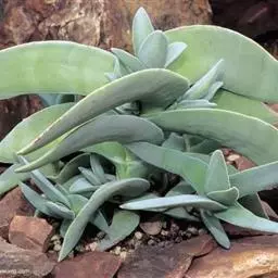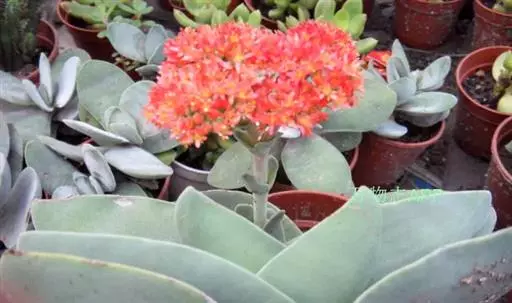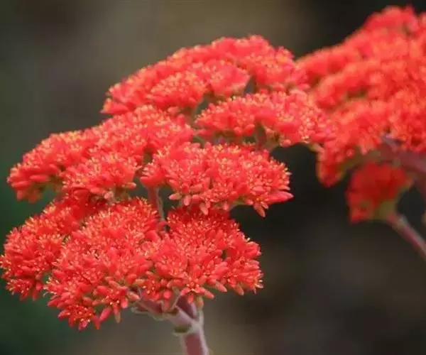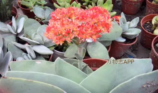 多浆肉质半灌木。株高1米左右。茎直立,分枝少。单叶互生或近轮生,尖刀形,叶长7-10厘米,宽3-4厘米,多汁,成对排列,侧向压缩,上升展开,末端钝,肉质肥大,灰绿色,叶基部联合,叶的边缘镶有细齿。伞房状聚伞花序,顶生,花深红色或橘红色,长达7毫米;花梗细长,高达100毫米。种子很小。花期夏季。