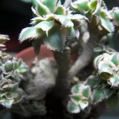戴冠曲景天科莲花掌属多肉植物,为亚灌木分枝多,叶片生长在茎端和分枝顶端集和成莲座叶盘,叶片倒卵形,植株容易群生。新生叶片总体为褐绿色,叶盘中心绿色,老叶绿色减少。夏季基本为深绿色,生长季节绿色微淡,戴冠曲的叶缘有睫毛状纤毛,非常可爱。叶面和叶背光滑,叶片尖,充足光线下边缘会呈现橘红色至桃红色,戴冠曲的颜色根据环境紫外线强度而变化。