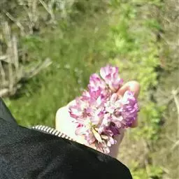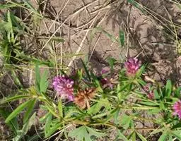 总状花序腋生,通常长2-2.5厘米,各部密被灰褐色至灰白色柔毛;苞片狭卵状披针形;花密生,具短梗;萼裂片披针形,远较萼管长,被灰白色长伏毛;花冠紫红色,约与花萼等长,旗瓣长圆形,基部具极短瓣柄,两侧具不明显的耳,翼瓣镰状,基部具瓣柄及一侧具微耳,龙骨瓣椭圆状,略弯,基部具瓣柄,一侧具1尖耳;雄蕊二体;子房被毛。荚果椭圆状,长7-8毫米,宽约5毫米,被短柔毛;种子2颗,近圆球形,黑色。花、果期夏秋季。