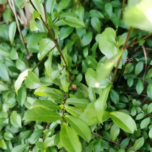 叶薄革质,倒卵形或倒卵状椭圆形,长2-5.5厘米,宽1-2厘米,顶端钝而有微凹或略尖,偶有近圆形,基部楔形,边缘密生细锯齿,有时稍反卷,上面鲜绿色,有光泽,下面淡绿色,无毛或初时疏被短柔毛,后变无毛,中脉在上面凹下,下面凸起,侧脉6-8对,两面均不甚明显;叶柄长2-3毫米。