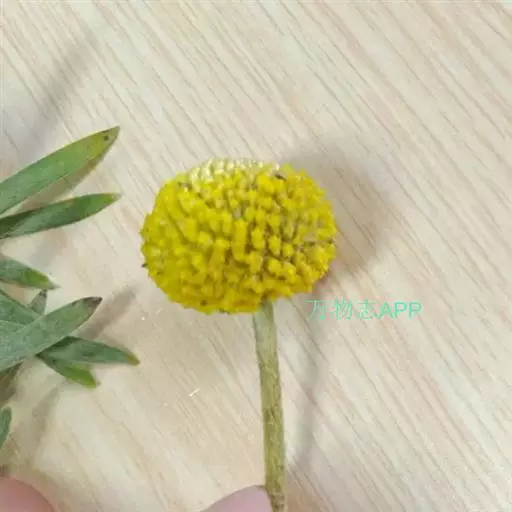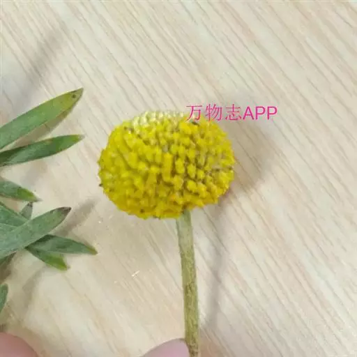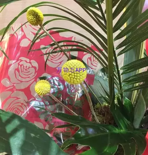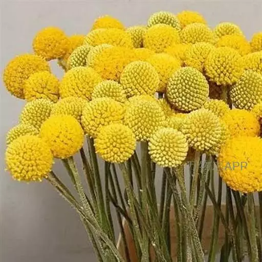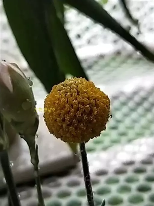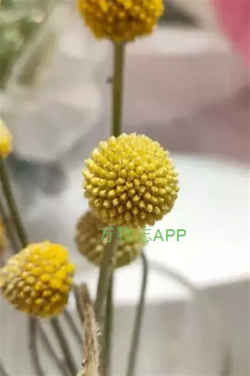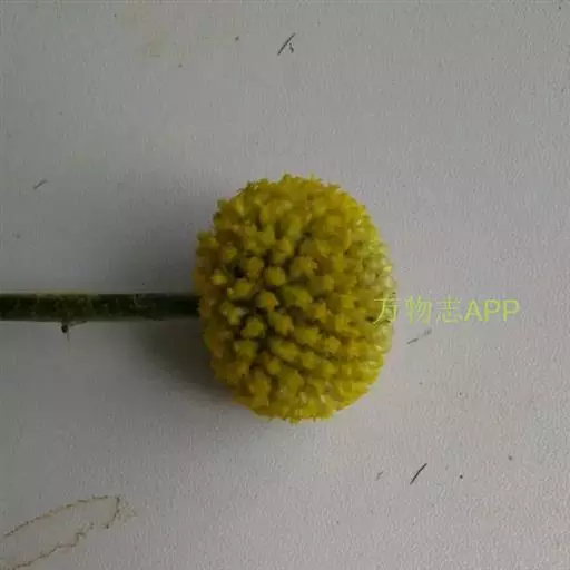 多年生植物,叶窄披针形,有蜡质,被灰白色柔毛,叶色灰绿、莲座化基生,植株丛生;花茎直立少分枝,顶生亮黄色的球形花,由多数管状花组成团伞花序,鼓槌状或金球状,高50~60cm。基部莲座状,丛生。叶窄披针形,有蜡质,被灰白色柔毛。花金黄色,由无数筒状花组成球形,花期7~8月。原产澳大利亚。