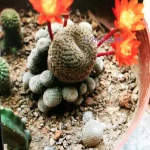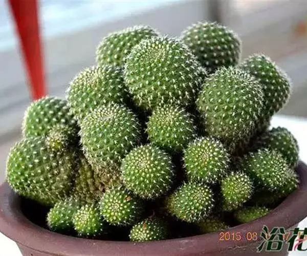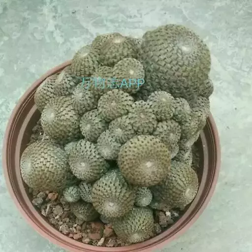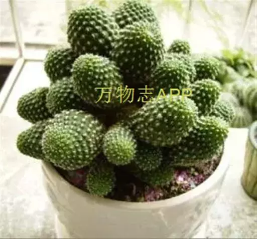 植株小,球形至圆筒状,基部易生出仔球而丛生,大大小小,叠垒成群。球体鲜绿色或墨绿色,棱角由螺旋状的疣瘤组成,棱16-20,疣粒顶端为刺座,生有灰白色的弯刺,刺25-30,白色或淡黄色,长0.2-0.3厘米。花着生在球下部刺座上,花小,红色,花筒长而细,自花受精。花期3-5月。盛开时,花朵数十朵,呈现倒钟形。花后坐果,小浆果圆形,浆果幼时绿色,6-7月,果实成熟,成熟的果实为橘红色。种子黑色。