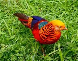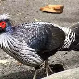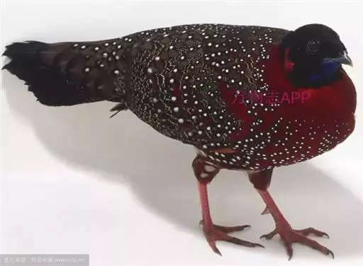 它的脸颊裸出,露出天蓝色的皮肤,周缘围着一圈桔黄色的羽毛。头、颈的后部和上胸为橙红色,尾羽为棕黄色,杂有黑色的虫蠹状斑,并具有黑色的横斑和端斑。其余体羽都是深栗红色,上面布满了圆圆的灰色眼状斑,背部的较小,胸、腹部的比较大,就像是红色的锦缎上洒满了大大小小的珍珠。由于雄鸟美丽的羽色和体 雄性红腹角雉 态,人们还给它起了许多优美动听的名字,如“秀鸡”、“星绣鸡”、“岩角鸡”、“大红鸡”等等。 与雄鸟相比,雌鸟的羽色就逊色多了,体长44—66厘米,体重830—1300克。上体一般为灰褐色,下体淡皮黄色,均布满了黑色的斑纹和白色的斑点。不过这种天然的保护色,可以使它在孵卵时免遭天敌的袭击。