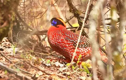 红腹角雉(学名:Tragopan temminckii)属于鸡形目雉科,雄鸟体羽及两翅主要为深栗红色,满布具黑缘的灰色眼状斑,下体灰斑大而色浅。雌鸟上体灰褐色,下体淡黄色,杂以黑、棕、白斑。