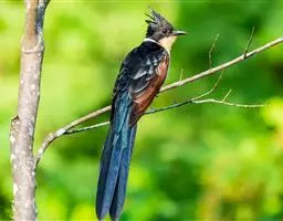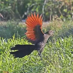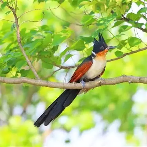 红翅凤头鹃:体长约38厘米,顶冠及凤头黑色,具显眼的直立凤头,背及尾黑色而带蓝色光泽,翅栗红色,…