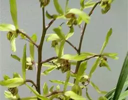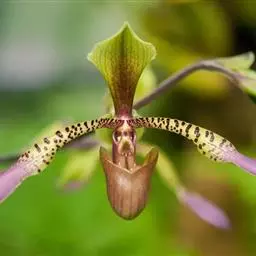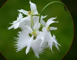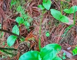 美冠兰(学名:Eulophia graminea Lindl.):假鳞茎卵球形、圆锥形、长圆形或近球形,直立,常带绿色,上部有数节。叶3-5枚,在花全部凋萎后出现,线形或线状披针形。花葶从假鳞茎一侧节上发出,高43-65厘米或更高,总状花序直立,长20-40厘米,常有1-2个侧分枝,疏生多数花;花橄榄绿色,唇瓣白色而具淡紫红色褶片;花瓣近狭卵形,长9-10毫米,宽2.5-3毫米,先端短渐尖;唇瓣近倒卵形或长圆形,长9-10毫米,3裂。蒴果下垂,椭圆形。花期4-5月,果期5-6月。