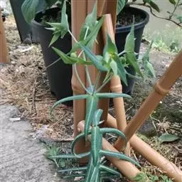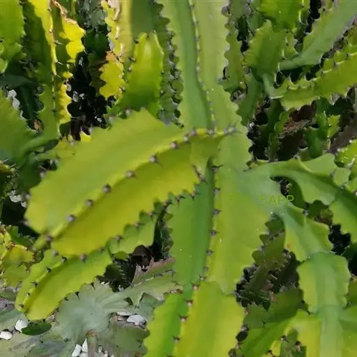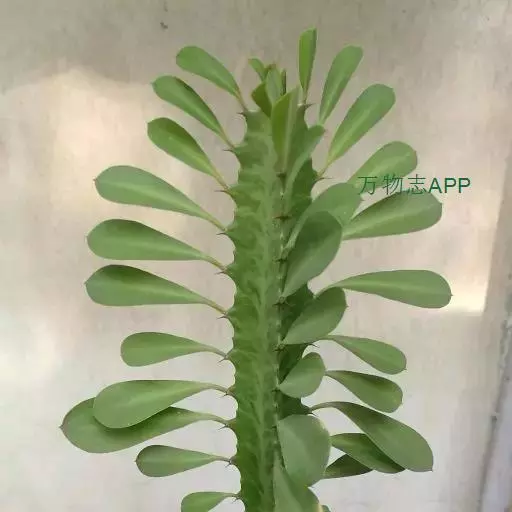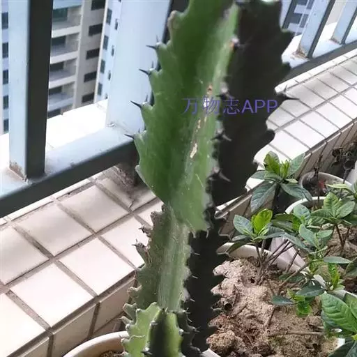 霸王鞭 肉质灌木,具丰富的乳汁。茎高5-7米,直径4-7厘米,上部具数个分枝,幼枝绿色;茎与分枝具5-7棱,每棱均有微隆起的棱脊,脊上具波状齿。