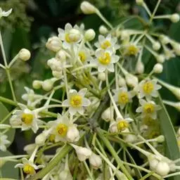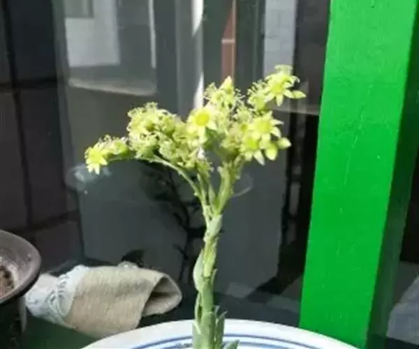 花序二歧聚伞状着生于节间凹陷处,且常生于枝的顶部;花序基部具柄,长约5毫米;总苞杯状,高与直径均约2.5毫米,黄色;腺体5,横圆形,暗黄色。