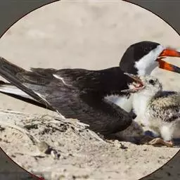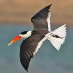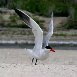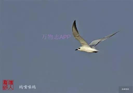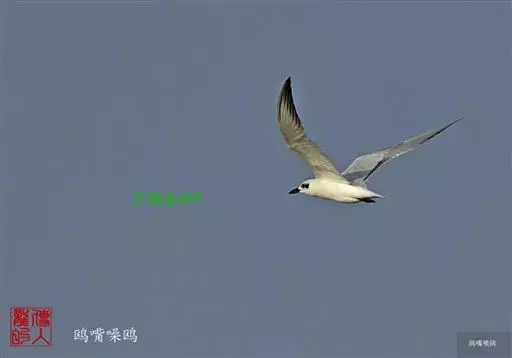 鸥嘴噪鸥(学名:Gelochelidon nilotica),中型水禽,体长31~39厘米。夏羽额、头顶、枕和头的两侧从眼和耳羽以上黑色。背、肩、腰和翅上覆羽珠灰色。后颈、尾上覆羽和尾白色,中央一对尾羽珠灰色。尾呈深叉状。冬羽头白色,头顶和枕缀有灰色,并具不明显的灰褐色纵纹。眼前有一小的黑色条纹;耳区有一烟灰色黑斑。后颈白色。常出入于海滨、河口及湖边沙滩和泥地。不喜欢植物茂密的水体。成对或成松散的小群营巢。通常营巢于大的湖泊与河流岸边沙地或泥地上,也在海边或河口滩涂盐碱沼泽地上营巢。巢多置于沼泽中有稀疏盐碱植物的土丘上,或河流与湖泊岸边裸露的沙滩上。巢甚简陋,主要在沙地或泥地上扒一浅坑,内垫以枯草即成。