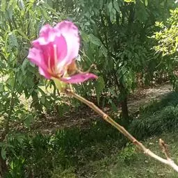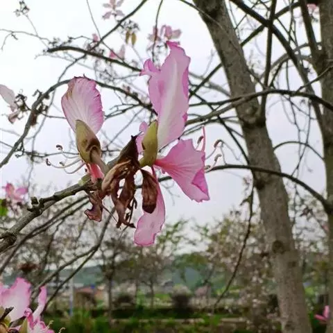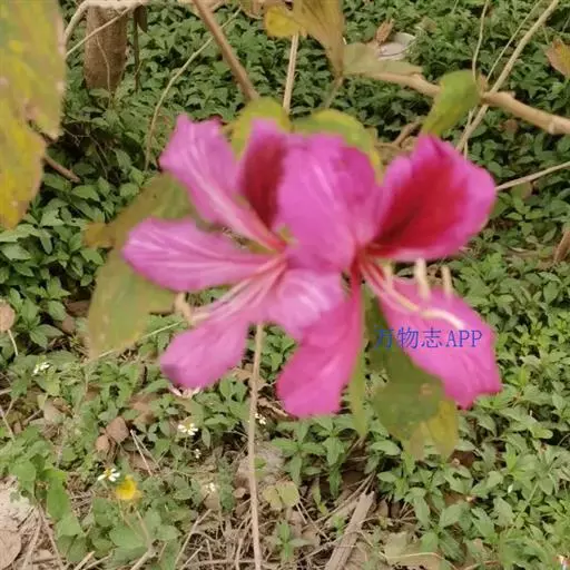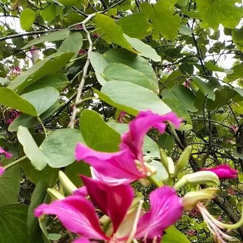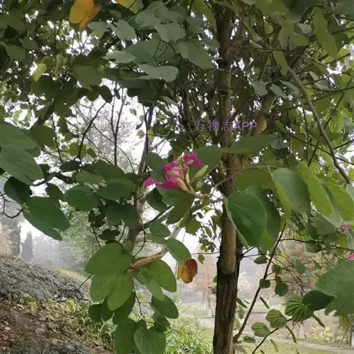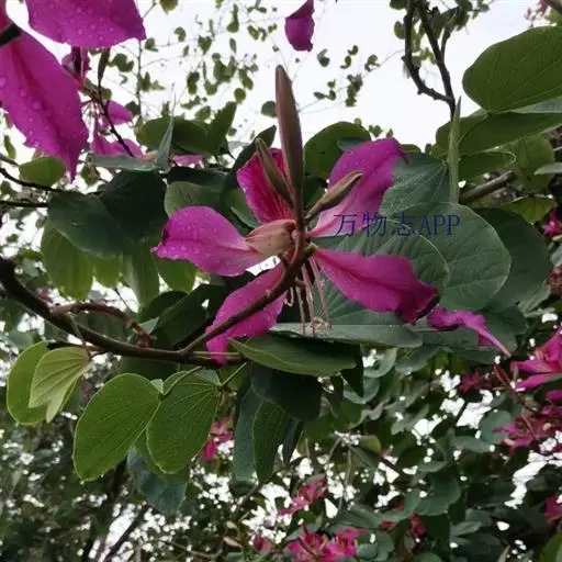 洋紫荆:落叶乔木;树皮暗褐色,近光滑;幼嫩部分常被灰色短柔毛;枝广展,硬而稍呈之字曲折,无毛。叶近…