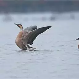 豆雁,雁形目鸭科。成鸟头、颈、背灰褐色,带淡黄色羽缘;尾上覆羽白色,尾羽黑褐色带白端,…