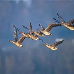 8月末,繁殖雪雁和它的子女们以及非繁殖雪雁聚集一堂,最多可达10000只,稍加停顿,就开始了飞往越冬区的征程。