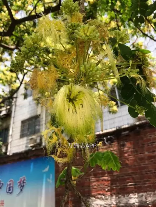 头状花序花时直径3-4厘米;总花梗通常长7-9厘米,1至数个聚生于叶腋;小花梗长3-5毫米;花芳香,花萼管状,长约4毫米,被微柔毛;花冠黄绿色,长7-8毫米,裂片三角状卵形;雄蕊白色或淡黄绿色。荚果带状,长15-28厘米,宽2.5-4.5厘米,扁平,麦秆色,光亮,无毛,常宿存于树上经久不落;种子4-12颗,椭圆形,长约1厘米,棕色。花期5-9月;果期10月至翌年5月。