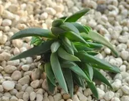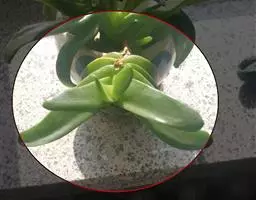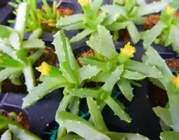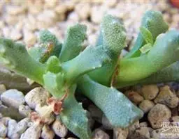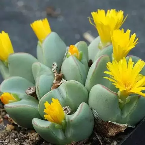 多肉植物,植株呈肉质灌本状,高20~30厘米,茎有短节,多分技。叶集中 快刀乱麻 在分枝顶端,对生,细长而侧扁,长约1.5厘米,先端两裂,外侧圆弧状,好似一把刀,叶色淡绿至灰绿色。花黄色,直径4厘米左右。
