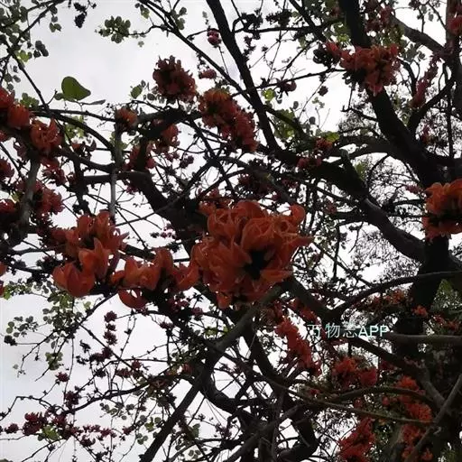 紫矿(Butea monosperma(Lam.) Kuntze),别名紫铆、胶虫树,蝶形花科(Papilionaceae)紫矿属落叶乔木,高10-20m。羽状三出复叶,革质,顶生小叶宽卵形或圆菱形,较大,侧生小叶歪卵形。总状或圆锥花序生于无叶枝的节上,花萼钟状,花大,桔红色,后渐变橙黄,形如小鸟,花萼像头部,翼瓣如张开的双翅,龙骨瓣似娇小的身躯,仿佛栩栩如生的鸟儿在空中快乐飞翔。