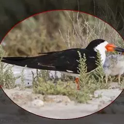 黑剪嘴鸥 剪嘴鸥体大(42厘米)的燕鸥样鸟。具橙红色的大嘴,顶冠色深,上体褐色,下体、后颈、次级飞羽横纹、尾上覆羽及尾均白。亚成鸟褐色而具白色鳞状斑纹。两翼甚长。特征为下嘴长于上嘴。