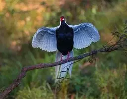 黑长尾雉大型鸡类,体长53~88厘米。雄较雌大。雄鸟通体紫蓝色,脸鲜红色,翅上有一条显著的白色翅斑…