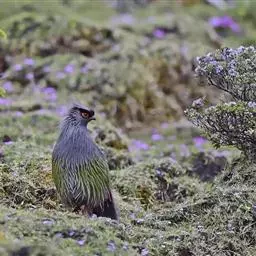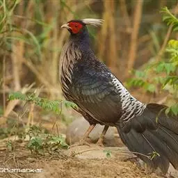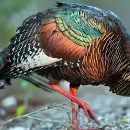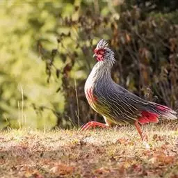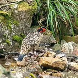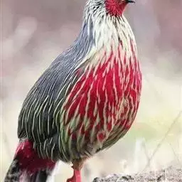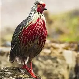 血雉雉科血雉属鸟类,别名血鸡、松花鸡,血雉的雄鸟大覆羽、尾下覆羽、尾上覆羽、脚、头侧、腊膜为红色,…