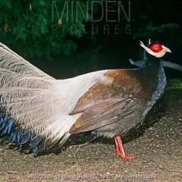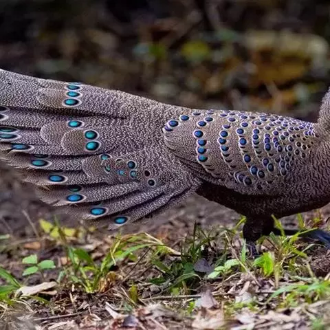大眼斑雉(学名:Argusianus argus):体长160-200厘米,雄鸟尾长105-143厘米;雌鸟体长72-76厘米,雌鸟尾长30-36厘米;雄鸟体重2040-2725克,雌鸟体重1590-1700克。体羽总体为褐色,头及颈均为蓝色,上胸赤红色,冠及颈背的羽毛黑色,脚呈红色。是东南亚最美丽的鸟类,翅的下端长有多个蓝色斑点,好像一双双明亮的大眼睛,大眼斑雉也由此得名。