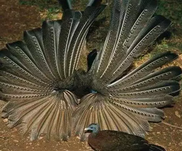 雄鸡是雉科所有种中最大的,长达2米。它们的尾羽很长,雄鸟最特别的地方是有很大、很阔及很长的次级飞羽和尾羽,长翼上装饰着复杂的大眼斑点装饰。雄性小鸡3岁就会有成年的羽毛。