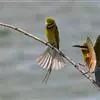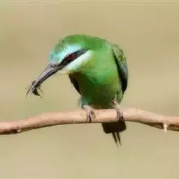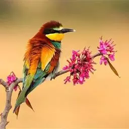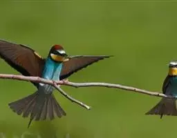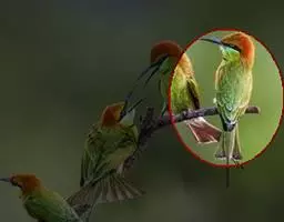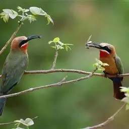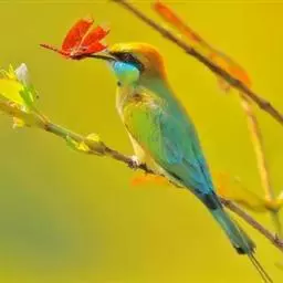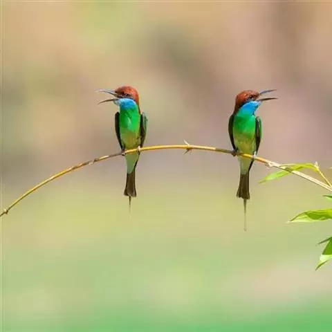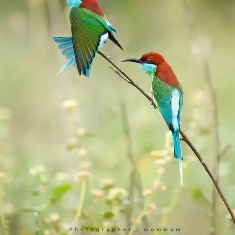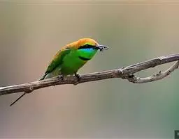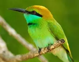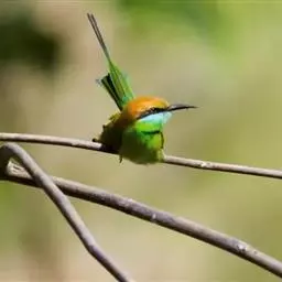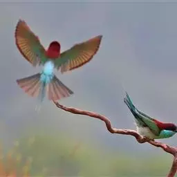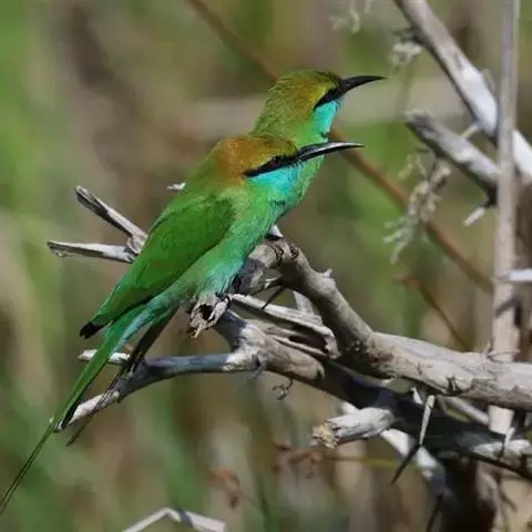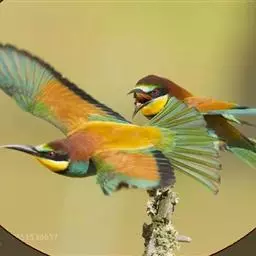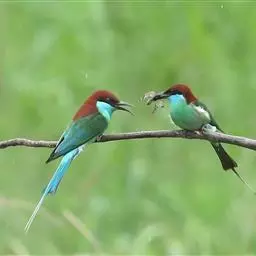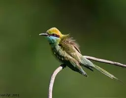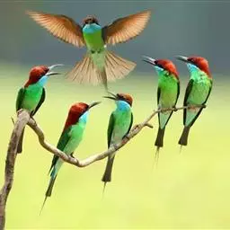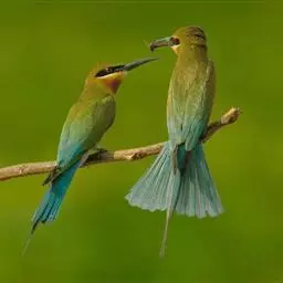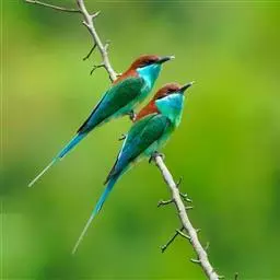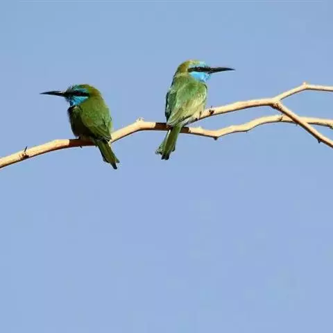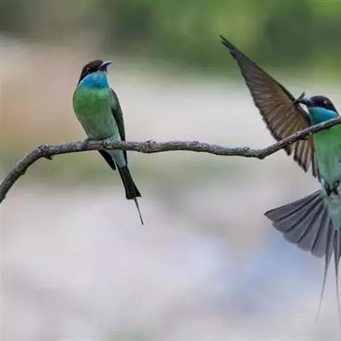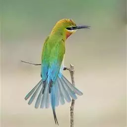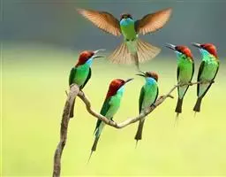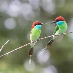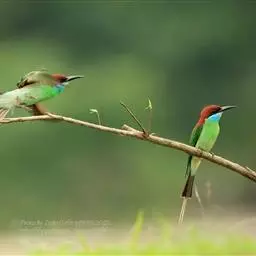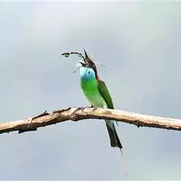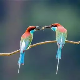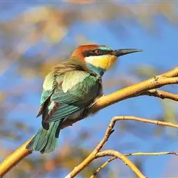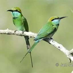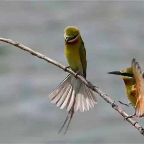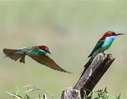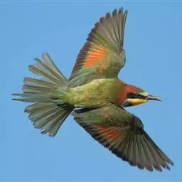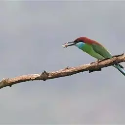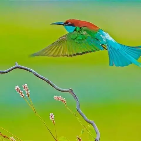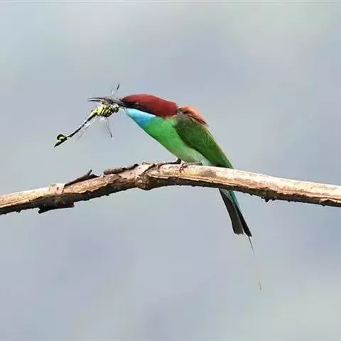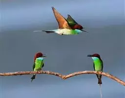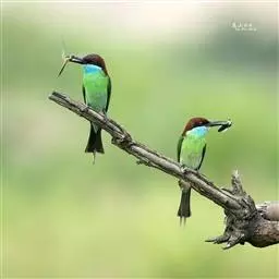 蓝颊蜂虎:是蜂虎科、蜂虎属的鸟类,共有2个亚种。体长27-33厘米,翼展46-49厘米,…